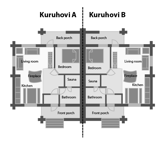 Kuruhovi is a rustic log cabin available to rent in Lappland, in Ruka Finland. The cottage includes two separate apartments both which accommodate up to 6 persons. Both apartments have one bedroom with a double bed and a loft with 4 beds. The sofas in the living room are sofa beds.