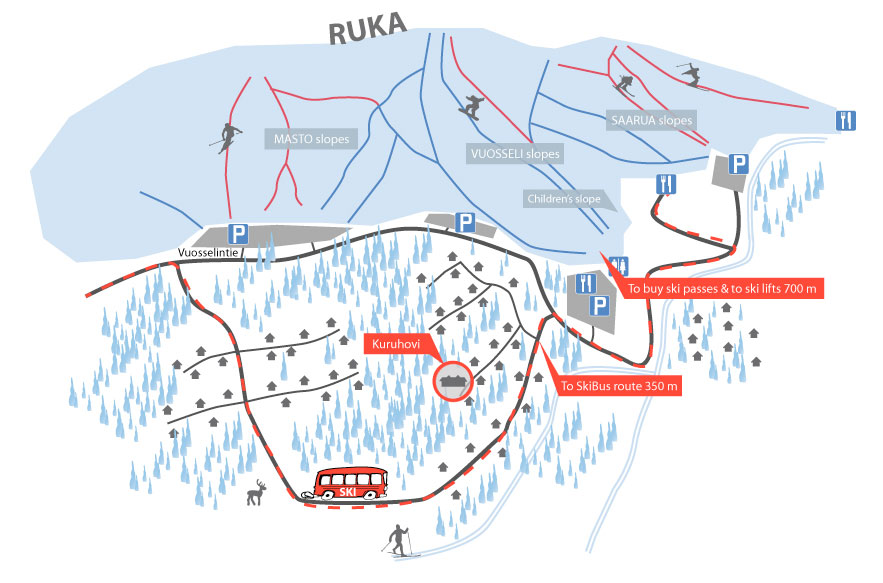 To Ski-Bus 200 m (nearest stop at the lower street Vuosselinrinne, check the timetables, free around Ruka when ski lifts are running if you have a valid ski lift ticket., without a ticket around 3 €/direction [for children 4-11 years 2 €]),